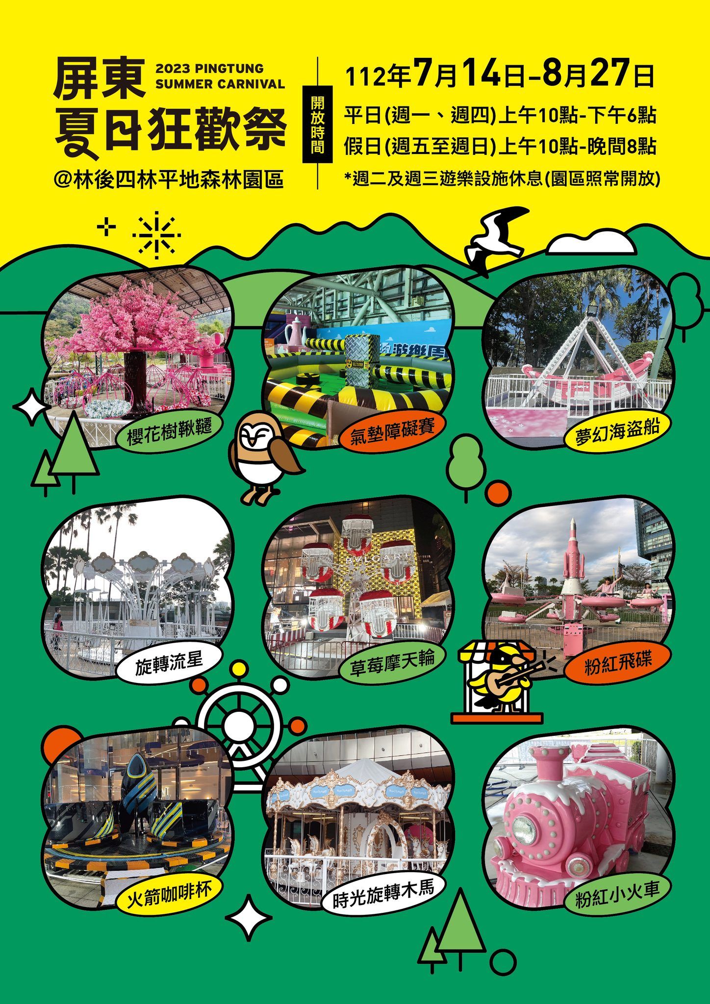 親子一日遊不曉得該去哪?日前盛大開幕的2023屏東夏日狂歡祭,7/14-8/27在充滿綠意、廣大的潮州林後四林平地森林園區,擁有眾多遊樂設施,假日甚至加碼市集和演唱會,即將成為夏季最受矚目的盛事之一。