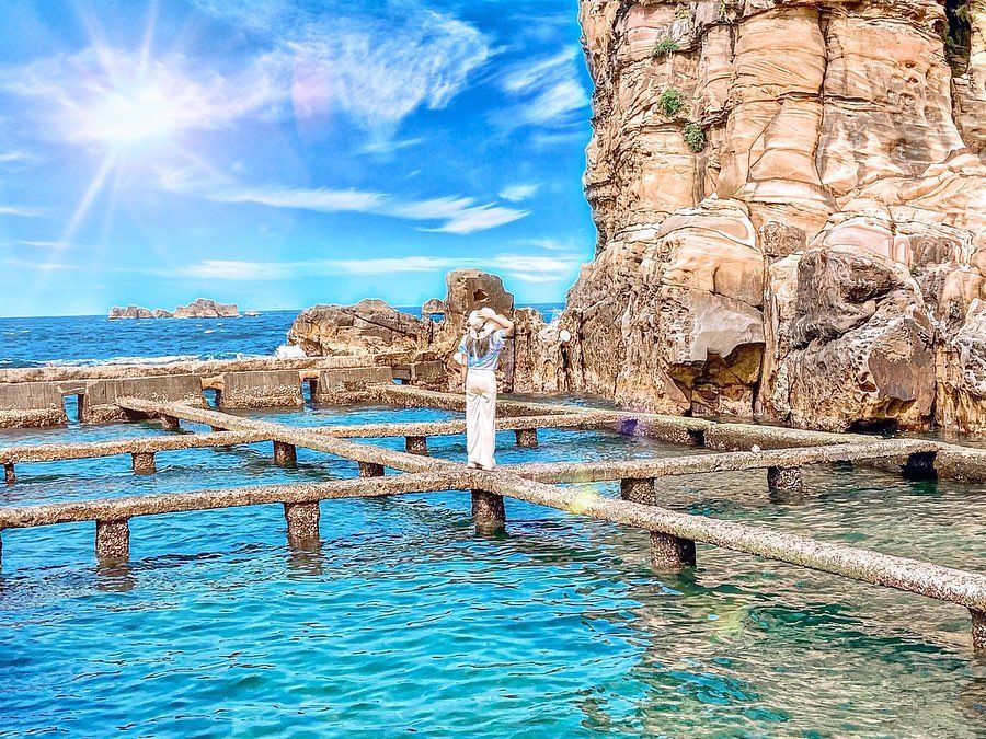 不需要到澎湖去,在野柳港附近也有天然九宮格!原為養殖九孔的地方,在廢棄後勁搖身一變成了野柳的私房打卡景點,踩在九宮格的交叉處,不遠處就是奇異形貌的駱駝峰,底下湛藍清澈的海水與遠方天空,實在是炎炎夏日中一方清涼的秘境。