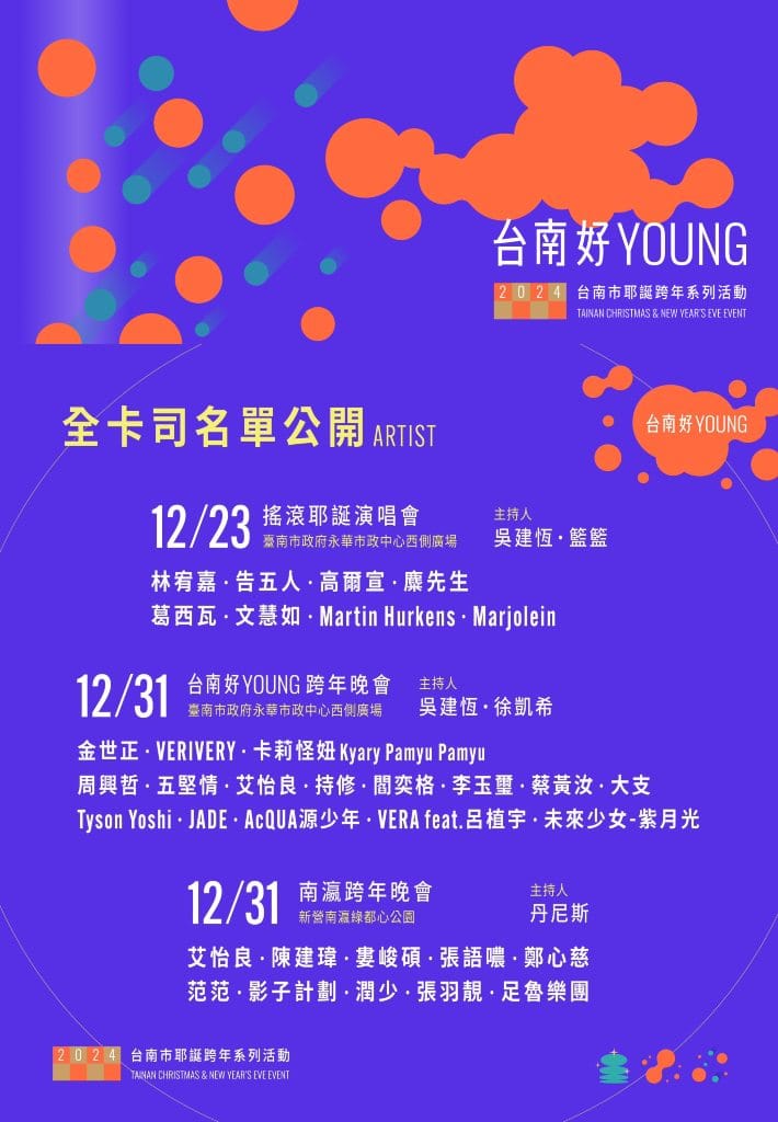 台南在12月23日,先讓台南搖滾耶誕演唱會預熱你的聖誕節。而跨年當晚,台南將成為年輕人的天堂,「台南好Young跨年晚會」將在永華市政中心西側廣場熱情舉行,為你送上耳目一新的音樂饗宴。同時,南瀛綠都心公園也將舉辦「南瀛跨年晚會」,讓你可以在不同場地感受音樂的熱情。