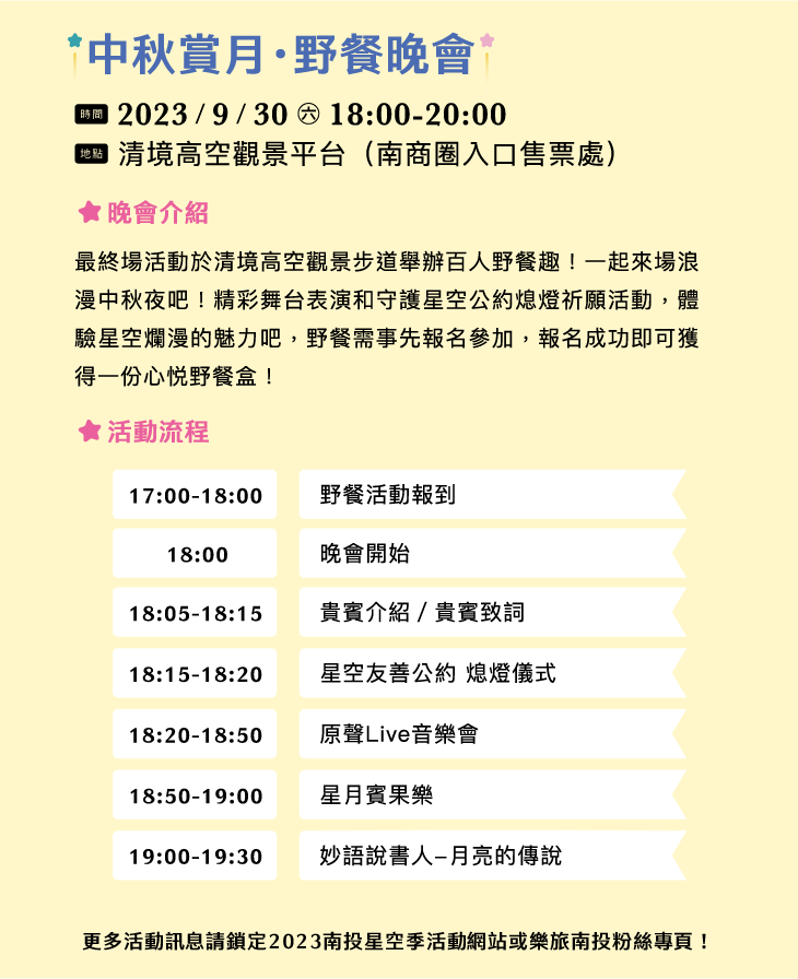 南投星空季的壓軸活動會在9/30(六)18:00-20:00登場,將在清境高空景觀平台舉行的中秋野餐晚會,讓我們在滿天星光下盡情享受親朋好友野餐的樂趣吧。只要是入住仁愛鄉的旅客,還可以優先報名哦。